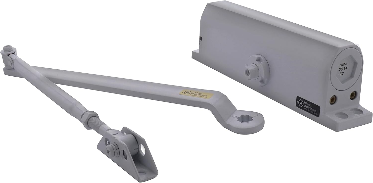 C.R. LAURENCE DC54A CRL Aluminum ANSI Grade 1 Spring Size 4 Surface Mount Door Closer. The CRL DC54 Size 4 Surface Mount Door Closer is perfect for most commercial applications. The Size 4 rating is suitable for interior doors up to 48" (122 mm) and exterior doors up to 42" (107 mm). Applicable door weight should be between 143 and 187 lbs. (65 and 85 kg). The closer is supplied with an adjustable back check feature to protect the doors and hardware from damage due to wind or violent door swings in the opening cycle. Both the closing and latching speeds are independently adjustable and will satisfy your customer"s requirements for smooth operating door control. All CRL Surface Mounted Closers are UL listed and warranted for ten years. A Parallel Arm Bracket and mounting hardware are included with each closer permitting universal installation for regular, top jamb or parallel arm applications. Optional accessories, such as Drop Plates and Hold-Open Arms, are available for special installations.. Part Numbers Variations: DC54A