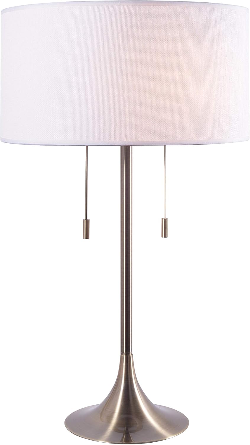 Simple and chic, the fast clean lines of this lamp shimmer and shine courtesy of the lustrous antique brass finish. Featuring dual pull chains, this lamp can easily transition from an ambient accent to a room filling illumination source. Ideal for a living room end table, nightstand, or desk, the 30-inch tall table lamp has a sturdy base that funnels up to the lamp body like animated mercury. Each lamp in this collection is outfitted with a crisp white textured drum shade, the perfect complement to accent modern and contemporary living spaces.